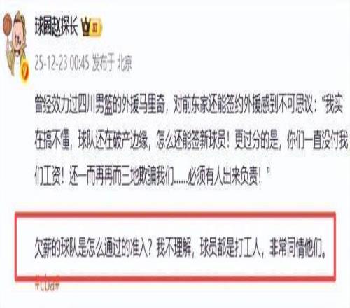 这就叫人无法理解了。既然依旧有欠薪,四川男篮未能还能继续在CBA征战呢?难怪媒体人球圈赵探长都看不下去了:“欠薪的球队是怎么通过的准入?我不理解,球员都是打工人,非常同情他们。”