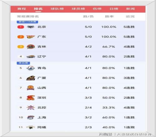 ③、青岛队4胜1负冲上第5名,将卫冕冠军广厦男篮压在身后;