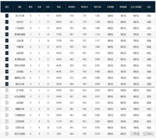 此外,近期辽宁、新疆等球队的表现都比较低迷,目前排名相对来说都不高。宁波、浙江等呈现出不错的上升势头,排名节节攀升。此外,四川男篮仍未拿到赛季首胜。