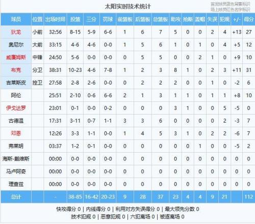 布克31分3板8助、狄龙27分7板5助、奥尼尔12分6板1助、威廉姆斯10分5板2帽、阿伦10分3板1助、古德温7分6板、邓恩7分5板3助、吉莱斯皮6分2板2助、弗莱明2分、伊戈达罗3助