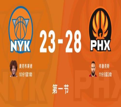 比赛进入首节末段,布伦森上篮造成布克犯规两罚全中,狄龙前场板造成罗宾逊犯规回应两罚全中,布里奇斯、古德温各自漂亮空切暴扣,紧接着古德温又是前场篮板打成2+1,分差不知不觉来到了25-14,尼克斯篮板球问题太大了,危急时刻罗宾逊、阿奴诺比、布伦森打了一波6-0将比分追到20-25太阳喊出暂停,回到比赛双方各得3分这样首节战罢太阳28-23领先尼克斯5分!