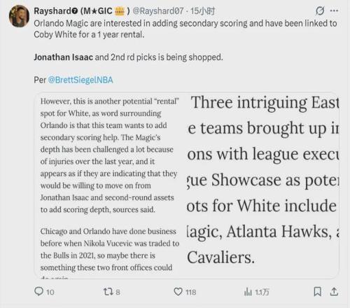 北京时间12月25日,据ClutchPoints记者Brett Siegel报道,魔术愿意交易艾萨克和次轮签,来增强进攻端的阵容深度,魔术的交易目标是公牛后卫科比-怀特。艾萨克打出了生涯最差的一个赛季,魔术决定放弃培养多年的“潜力股”。