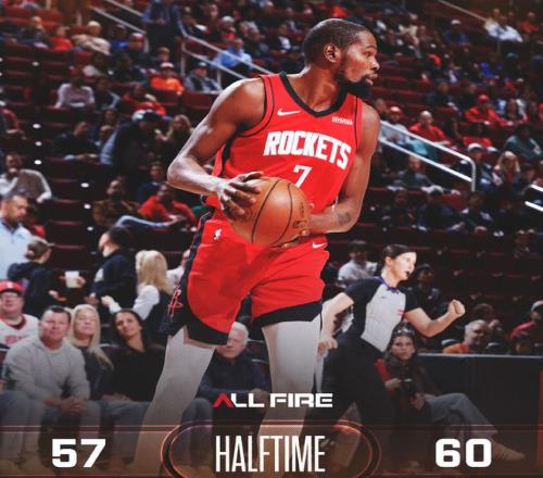 次节回来,特雷·琼斯弧顶追身大空位三分命中,公牛扳平比分,乌度卡暴怒直接喊停比赛。申京一条龙不紧不慢单臂劈扣,武切维奇全程目送,杜兰特招牌翻身后仰稳稳命中,成为火箭首位得分上双球员。申京高吊小史密斯又失误,气得懊恼摊开双手直蹦。阿门强攻内线几乎压哨被吹进攻犯规,火箭又交出球权,今天失误太多了。杰伦-史密斯快攻打进后,再造犯规两罚全中,半场战罢,公牛60-57反超火箭3分。