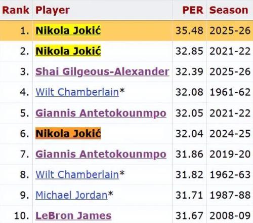 个人PER值高达35.48,放眼NBA历史更是断档的领先第一,而在他身后的历史第二,还是约基奇。
