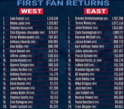 12月30日,NBA官方公布球迷首轮投票结果,在西部球迷投票中,东契奇第一,约基奇第二,库里第三!