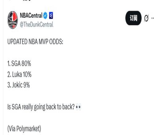 若约基奇失去奖项评选资格,他连续7次入选最佳阵容的纪录将就此终结,连续5年在MVP评选中位列前二的表现也将中断。体育预测平台Polymarket更新了本赛季当选常规赛MVP的球员概率,其中亚历山大以80%居首,东契奇10%排名第二,约基奇9%位居第三。而在约基奇受伤前,该平台上约基奇的当选概率是47%,亚历山大是43%。
