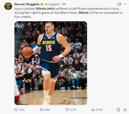 北京时间12月31日,丹佛掘金官方宣布,尼古拉-约基奇遭遇了左膝过伸的伤病,但膝盖的韧带没有结构性伤,他的伤势将在四周后重新评估。换言之约基奇至少要缺席四周,这一个月的时间对于掘金来说是巨大的打击。