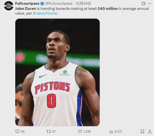 NBA记者Vince Goodwill报道,活塞会给杜伦提供一份类似申京的大合同,也就是5年1.85亿美元。双方分歧并不大,最终会达成一致。均薪3000万-4000万美元,对杜伦来说是一个合理价格,毕竟他现在还没有太多的进攻手段。