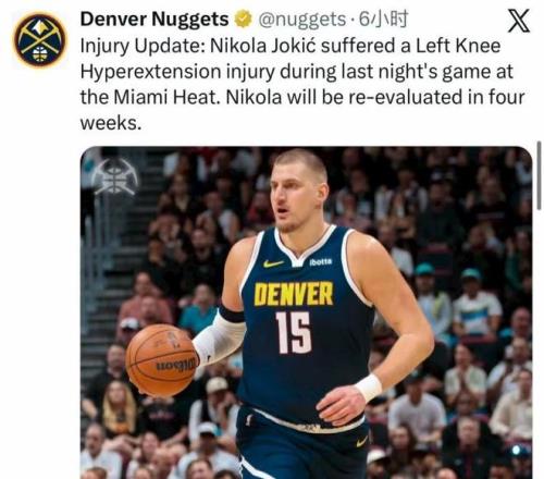 约基奇,左膝过度伸展,没有结构性损伤,四周后重新评估伤情。