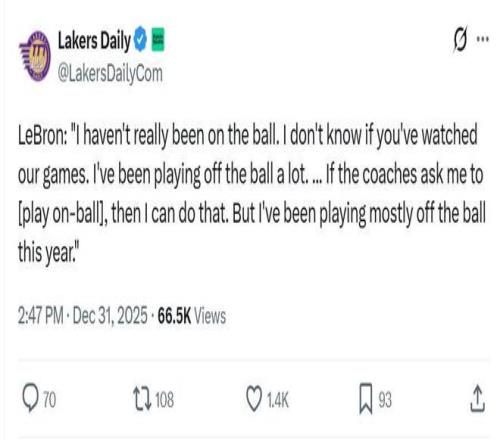 Lakers Daily写道:“别再试图让詹姆斯成为追梦格林,让他做自己,让其他人来适应他。”