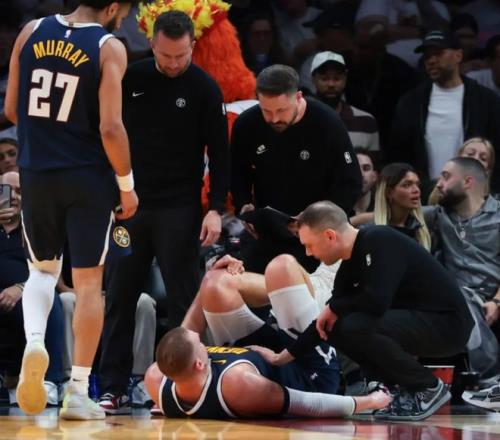 昨天丹佛掘金队跟迈阿密热火队的比赛里,约基奇在上半场就出现了伤病,当时掘金队的琼斯被热火队的哈克斯撞了一下,往后退的时候踩到了约基奇的脚,于是约基奇的膝盖也过度拉伸,受伤退赛。