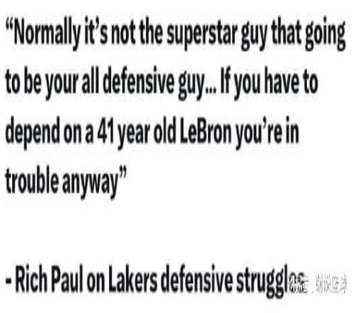 与此同时湖人现在防守问题,真的是显而易见,著名经纪人里奇-保罗直接开喷,认为生涯暮年的詹姆斯,被迫要当防守尖兵,简直是非常离谱的事情。里奇-保罗还坦言,一般情况下防守核心,不会是球队巨星,更何况詹姆斯都41岁了,却承担大量防守任务,这就更加离谱了。