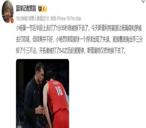 后厂村体工队评价:杨瀚森只打1分35秒,有一说一他登场的时间是无法让斯普利特满意的,先是失误然后投了一个三分过桥,玛特科维奇又是三分又是暴扣,杨瀚森一上来鹈鹕就一波小高潮。