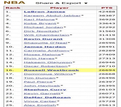 在本场比赛之前,威少总得分为26694分,距离前一位的“大O”奥斯卡-罗伯特森相差16分。此役过后,威少完成了对罗伯特森的超越,升至历史总得分榜第15位,他也成为NBA历史上得分最多的后卫球员。目前排在第14位的是“大梦”奥拉朱旺,威少距离前者还有235分的差距,本赛季完成超越指日可待。