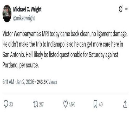 根据马刺队记Michael C. Wright报道,文班亚马核磁共振结果显示没有韧带损伤,下一场对阵开拓者的比赛依旧是出战成疑。