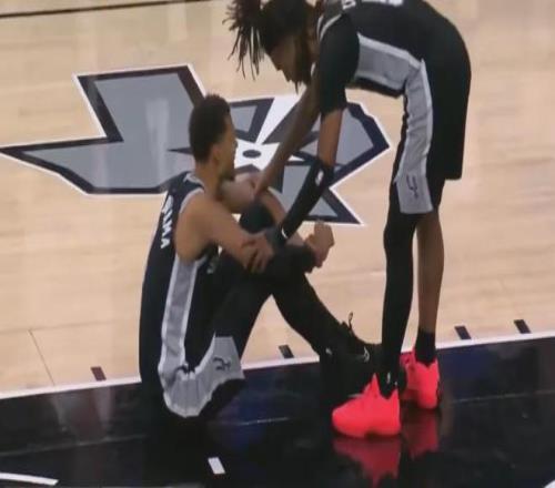第四节刚开始,文班亚马抢篮板,落地时不小心膝盖过度伸展了。