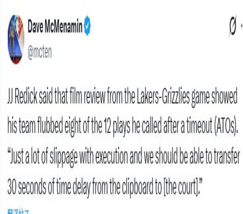 赛季至今,湖人21胜11负,排名西部第五。虽然球队上一场128-121击败灰熊,但很显然,雷迪克依然对球队的表现感到不满。