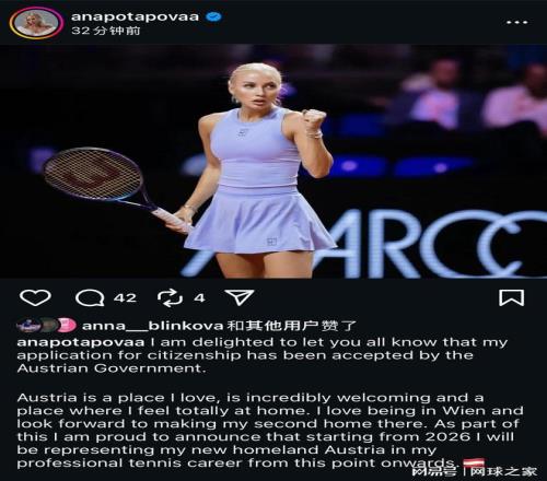 几乎在同一时间,另外两位俄罗斯选手也完成了“国籍转换”。世界排名第112位的拉希莫娃决定代表乌兹别克斯坦参赛,她的母亲是乌兹别克人;年仅22岁的季莫费耶娃也在今年11月宣布代表乌兹别克斯坦出战,她的家庭已于六个月前移居该国。今年3月,世界排名曾达第12位的俄罗斯名将卡萨金娜宣布获得澳大利亚永久居留权;世界排名第51位的俄罗斯网球选手波塔波娃宣布,她的奥地利公民身份申请已获批准,将从2026年起代表奥地利参赛。她在一份声明中写道:“奥地利是我热爱的国度,这里的人们无比热情,让我感受到宾至如归的温暖。”