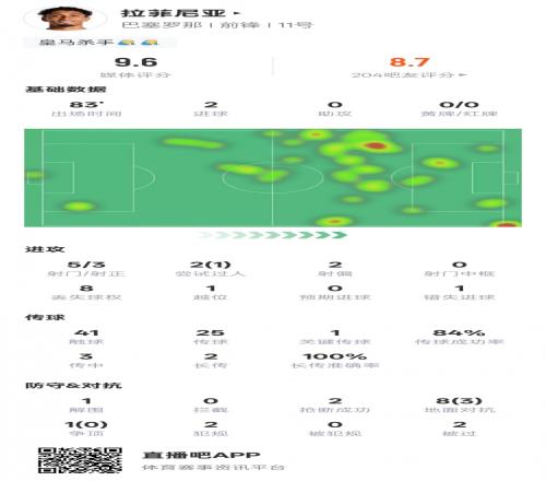 体育播报1月12日宣 西超杯决赛,巴萨对阵皇马,拉菲尼亚首发出战,贡献双响,送出1次关键传球,也错失1次进球机会,评分9.6。