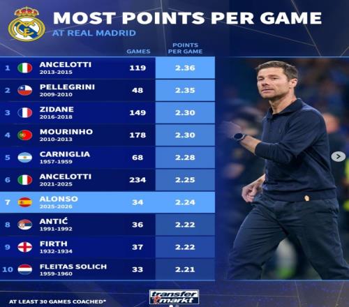 体育播报1月13日宣 皇马已经官宣解雇哈维·阿隆索,《转会市场》统计显示后者位列皇马队史拿分榜第7位。