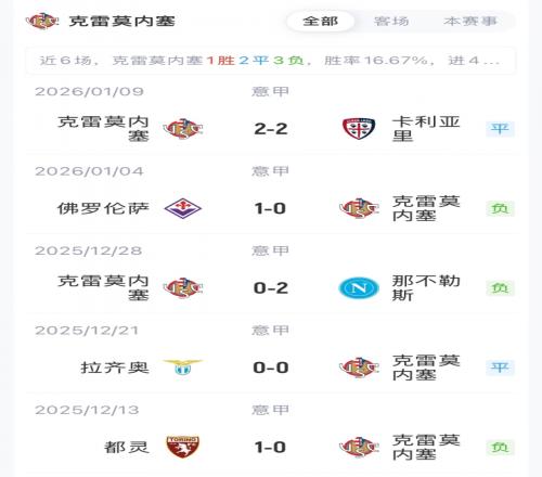 克雷莫内塞首发:1-奥代罗、6-巴斯奇罗托、24-泰拉恰诺、15-比安切蒂、7-泽尔宾、3-佩泽拉、33-格拉西、38-邦多、11-约翰森、90-博纳佐利、10-瓦尔迪