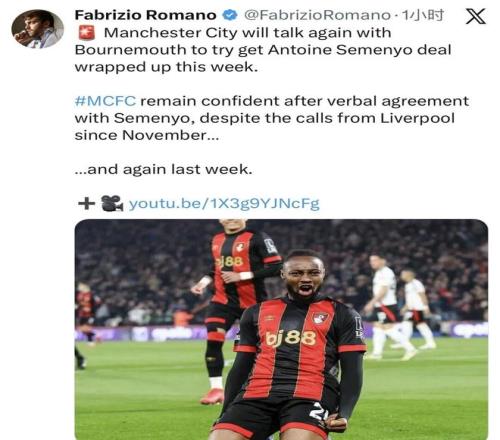 据名记罗马诺的最新消息,曼城将再次与伯恩茅斯谈判,力争在本周敲定塞梅尼奥交易。