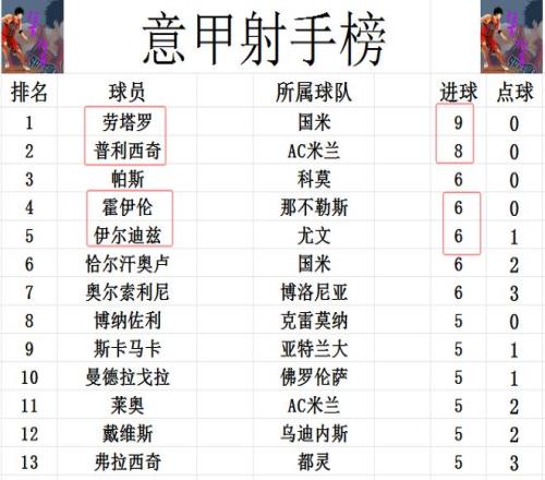 射手榜方面,劳塔罗打入制胜球,9球继续领跑射手榜,射手榜第2也是AC米兰,而且普利西奇也只差劳塔罗1球。霍伊伦梅开二度,追上伊尔迪兹,恰尔汗奥卢和奥尔索里尼,6球并列第3。