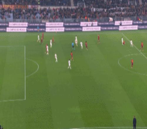 罗马在上轮关键的争4对决中输给尤文,加上本轮尤文先赛赢球,罗马被挤出前4,要想重回前4,罗马今天就必须在主场拿下热那亚。开场后罗马就展开了猛烈攻势,第13分钟,罗马中前场右侧断球反击,曼奇尼断球直接往前踢,巴斯克斯头球解围失误成“助攻”,把球顶到了禁区右侧苏莱脚下,苏莱笑纳大礼,将球卸下后单刀冷静推射得手,罗马1:0首开纪录。