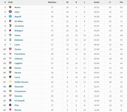 2025整个年度,罗马共参加了37场意甲比赛,取得26胜4平7负的成绩,打进52球丢22球,净胜球为30球,积分为82分。