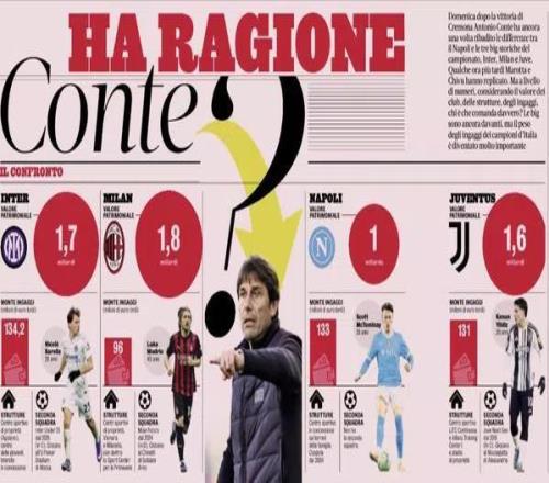 不过在本轮联赛的赛后发布会上,当记者问到为什么那不勒斯无法真正掌控比赛时,孔蒂回答道:原因有很多。这是一条刚刚开始道路,从整体结构层面来说我们还没准备好。以我看来,尤文、国米和AC米兰在结构、二队配置、薪资总额以及资产价值方面,都与其他球队不同。每当不是这三支球队中的一支夺冠,那就意味着完成了一项非凡的成就。我们试图在球场上弥补这种差距,但必须承认,这些球队本身就处在不同的层级。