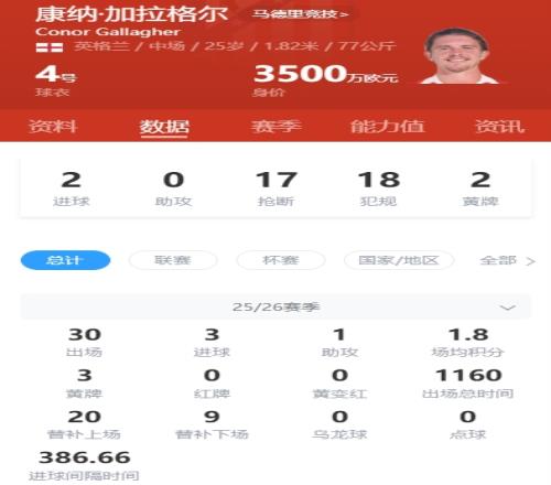 加拉格尔在2024年从切尔西加盟马竞,本赛季为马竞出场30次,有3个进球。
