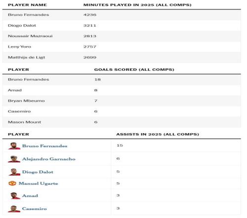 以下是曼联球员在1-0战胜纽卡斯尔联后的年度部分排名数据。