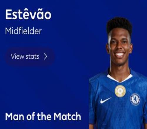 此役主场对阵伯恩茅斯,首发出战的埃斯特旺在上半场禁区倒地制造点球,并由帕尔默主罚命中。