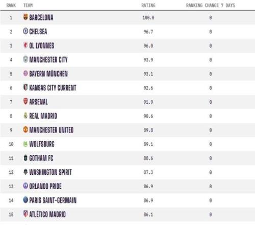 在女足俱乐部排名中,巴塞罗那女足以满分100分高居榜首。皇家马德里女足以90.6分位列全球第八,成功跻身由巴萨女足、切尔西女足、里昂女足等队主导的世界顶级精英行列。