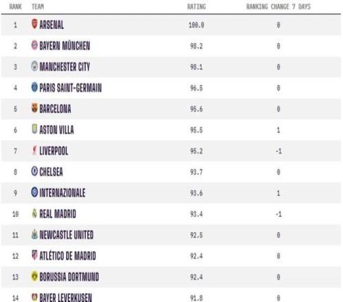 在男足排名中,阿森纳以100分位居第一。皇马目前的评分为93.4分,位列全球第十,在近期排名中有所下滑。