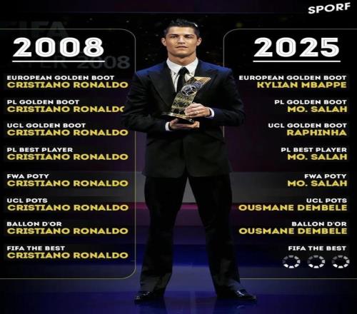 2008vs2025奖项对照榜:C罗一人包圆!姆巴佩萨拉赫只能分着拿