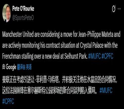 记者Pete O'Rourke透露:“曼联正在考虑引进马特塔,并积极关注他在水晶宫的合同情况,这位法国前锋同水晶宫的新合同谈判陷入僵局。”实际上,水晶宫正面临着严重的人员流失风险。过去一年,水晶宫的出色发挥令多名主力成为转会市场香饽饽。夏窗埃泽已转投阿森纳;马克·格伊合同临近到期,夏窗差点加盟利物浦,预计下个夏窗自由离队。