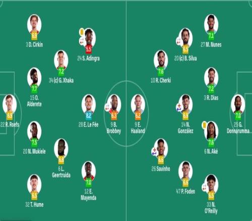 曼城首发:25-多纳鲁马、27-努内斯、3-鲁本·迪亚斯、6-阿克、33-奥赖利、14-尼科·冈萨雷斯(46'16-罗德里)、20-B席(85'4-赖因德斯)、26-萨维尼奥(51'11-多库)、47-福登、10-谢尔基、9-哈兰德