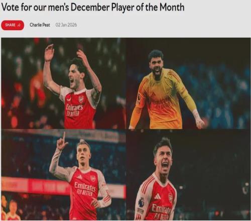 官方:赖斯、拉亚、特罗萨德和祖比门迪被提名为了阿森纳12月份队内最佳候选。