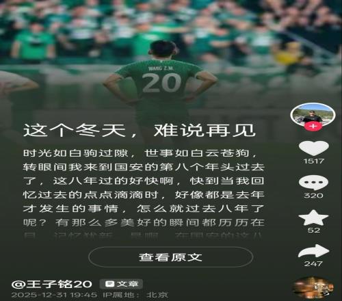 同样发文告别的还有北京国安的王子铭。王子铭在告别中表示,自己非常荣幸和满足在国安收获的诸多感动,表示无论在哪都会关注和支持国安。