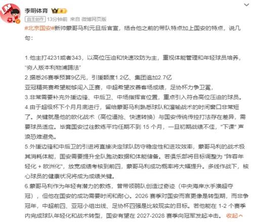 周四,博主李明体育透露,北京国安2026赛季预算9亿,引援额度1.2亿,目标是“亚冠精英赛希望能够闯入正赛”“足协杯卫冕”。